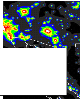 Natural areas are dark at night but the photographs below show how much light is emitted from nearby cities. Yuma, Phoenix, and Tucson show sky glow from light pollution. But the Western Desert great night sky is a resource that is becoming increasing rare. This image shows North America's light pollution. Photos by P. Cinzano/F. Falchi (University of Padova) C. D. Elvidge (NOAA NG Data Center).